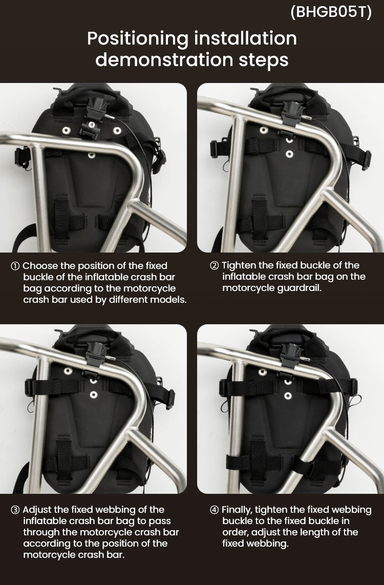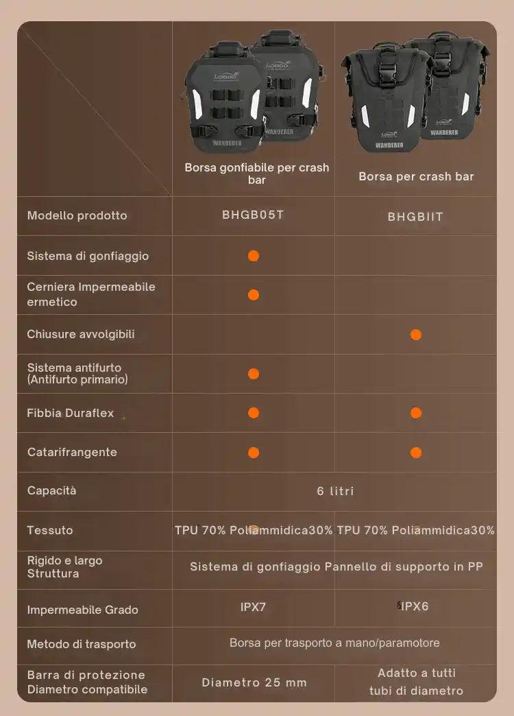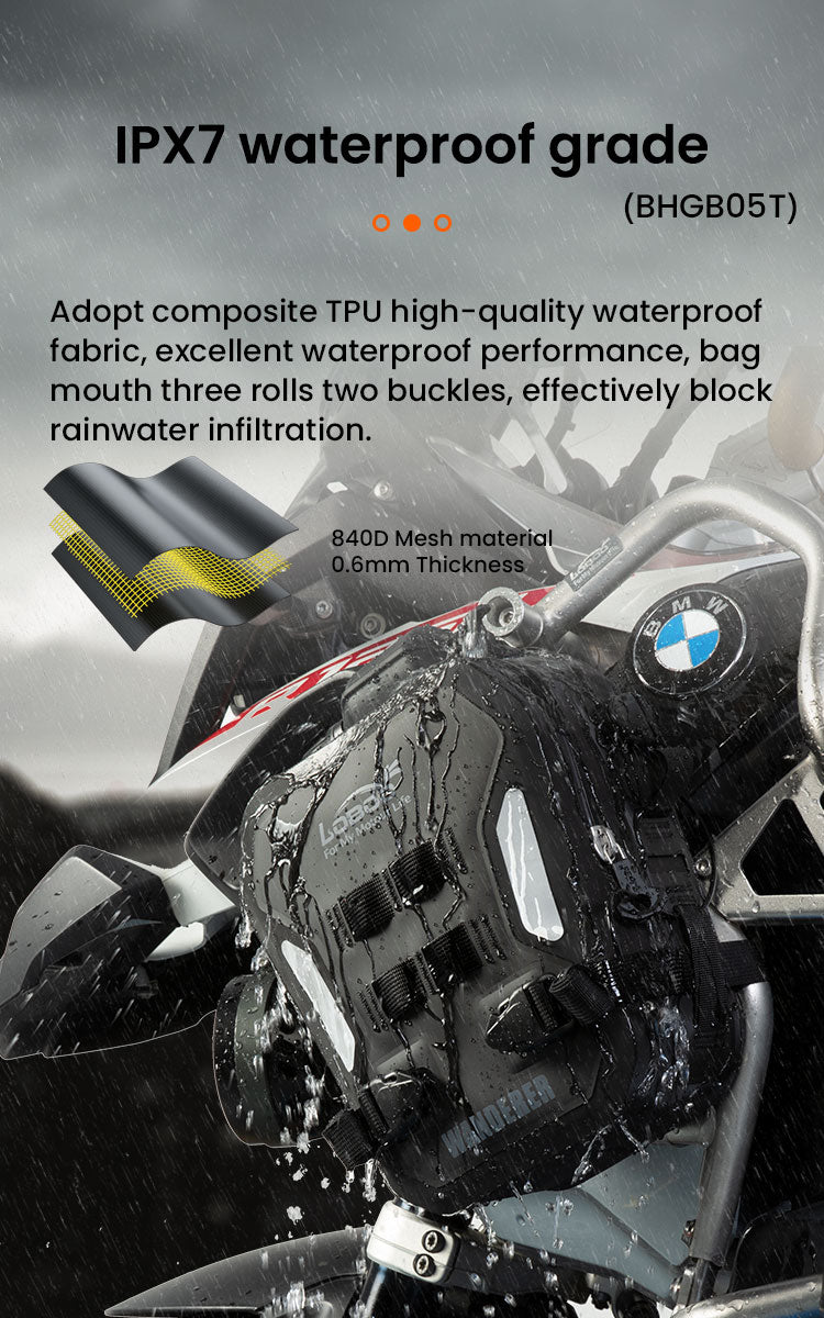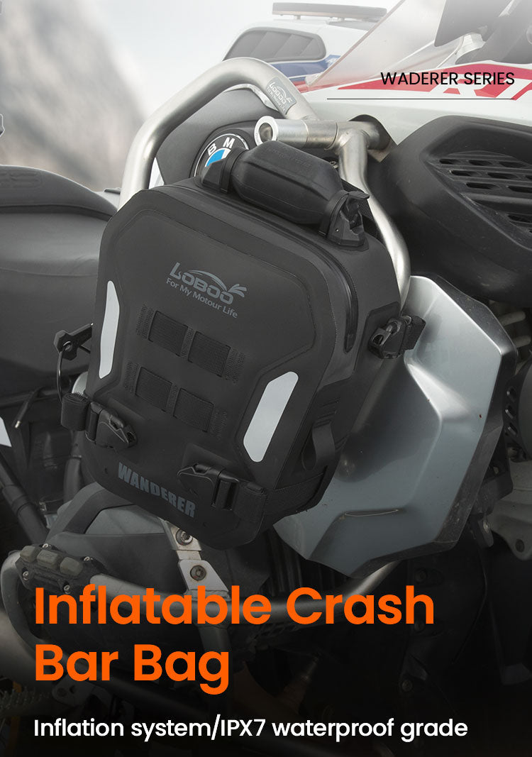 Bolsas inflables Wanderer para barras de protección | IPX7, inflables a prueba de golpes, 6 l cada una, antirrobo, montaje rápido Protección activa + espacio útil en la barra de protección Las bolsas inflables Wanderer combinan protección inflable contra impactos y una capacidad de carga de 6 l por lado en un cuerpo compacto.