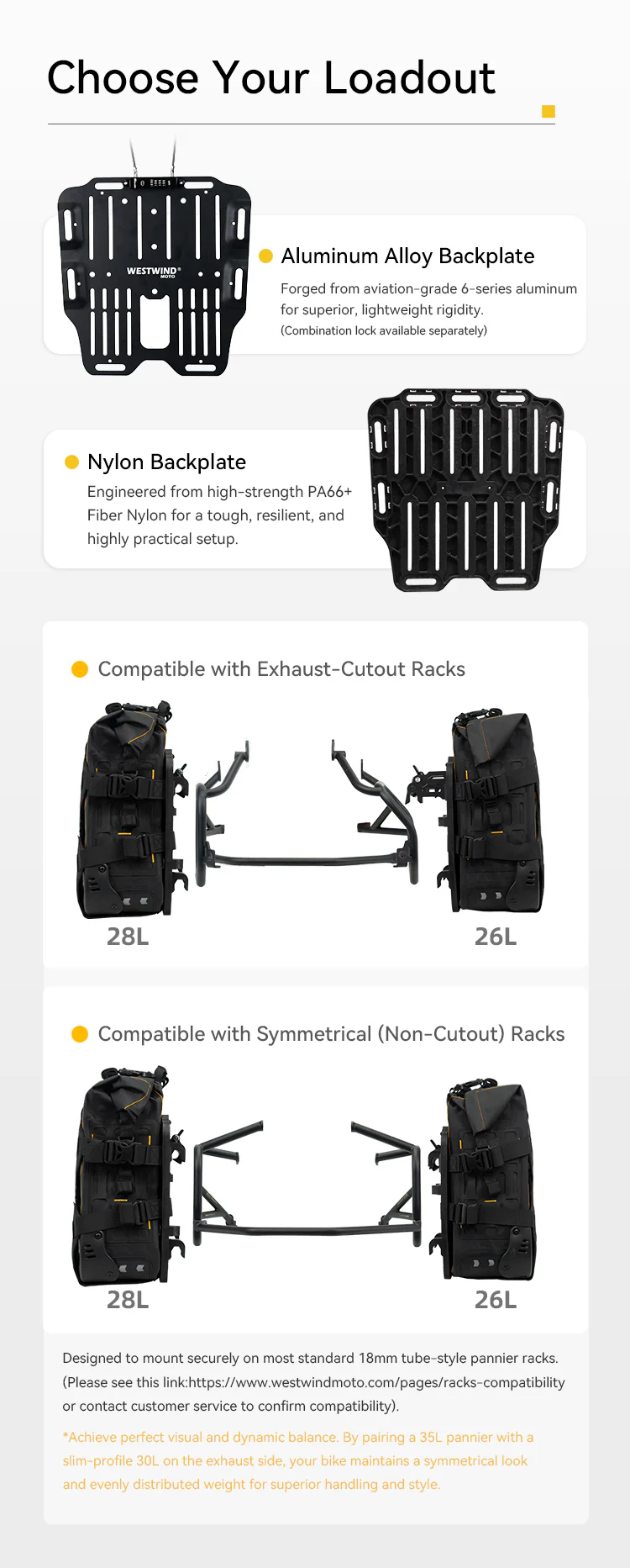 El compromiso perfecto entre blando y duro: Westwind Hussar 26-28 El kit de maletas blandas para moto 54L: Westwind Hussar 26-28 es la solución definitiva para quienes buscan la seguridad de las maletas blandas sin renunciar a la estabilidad de la...