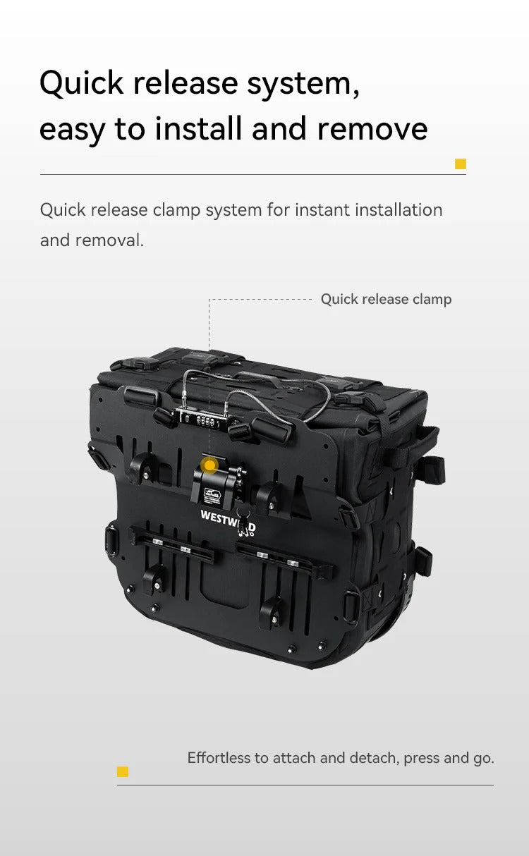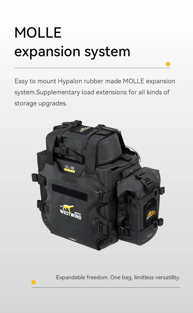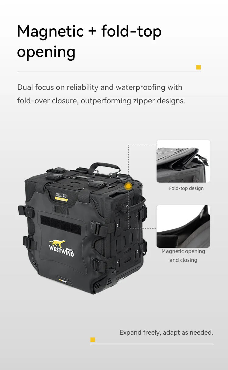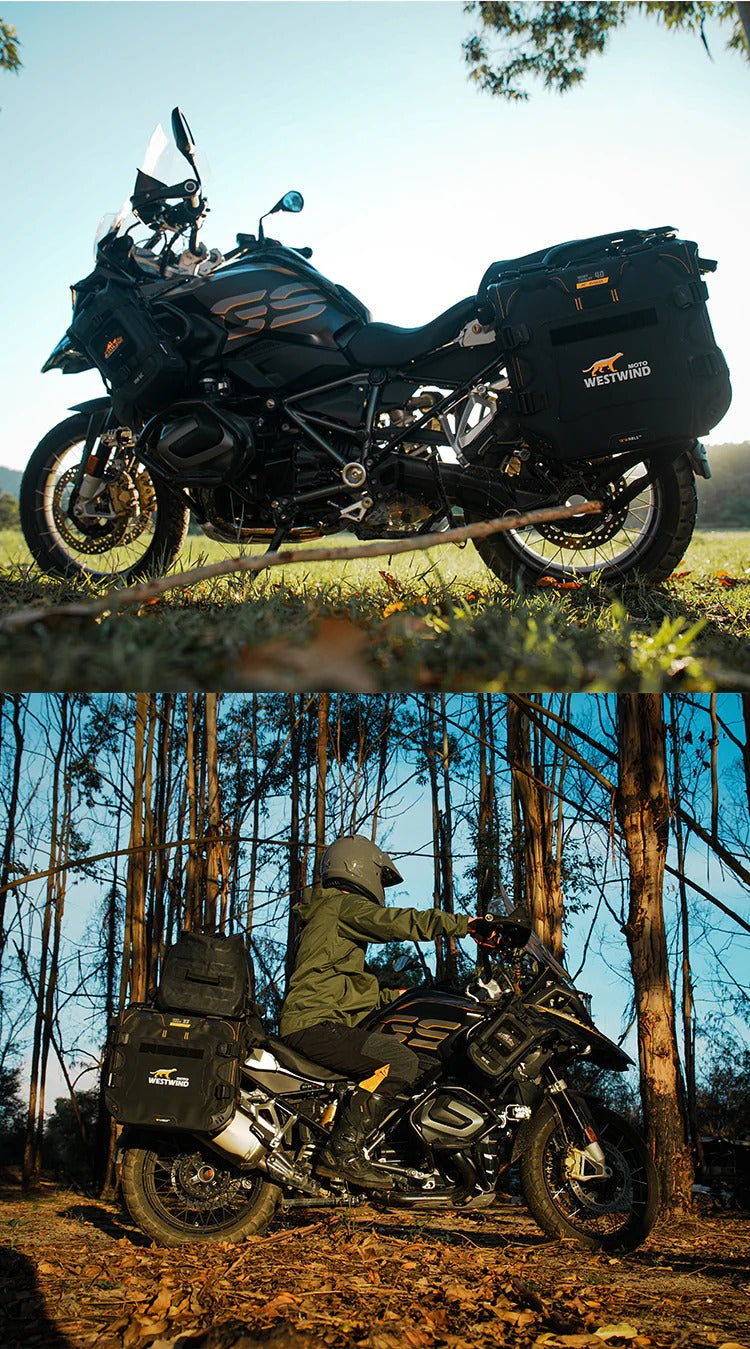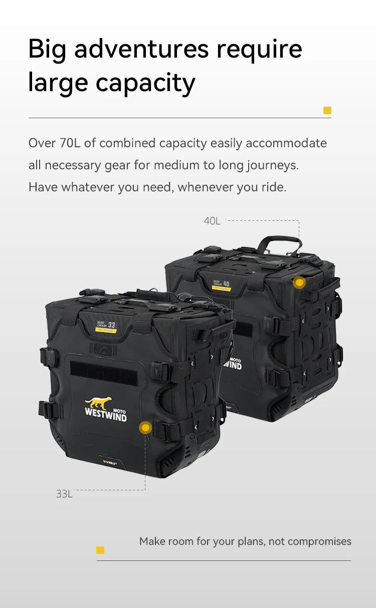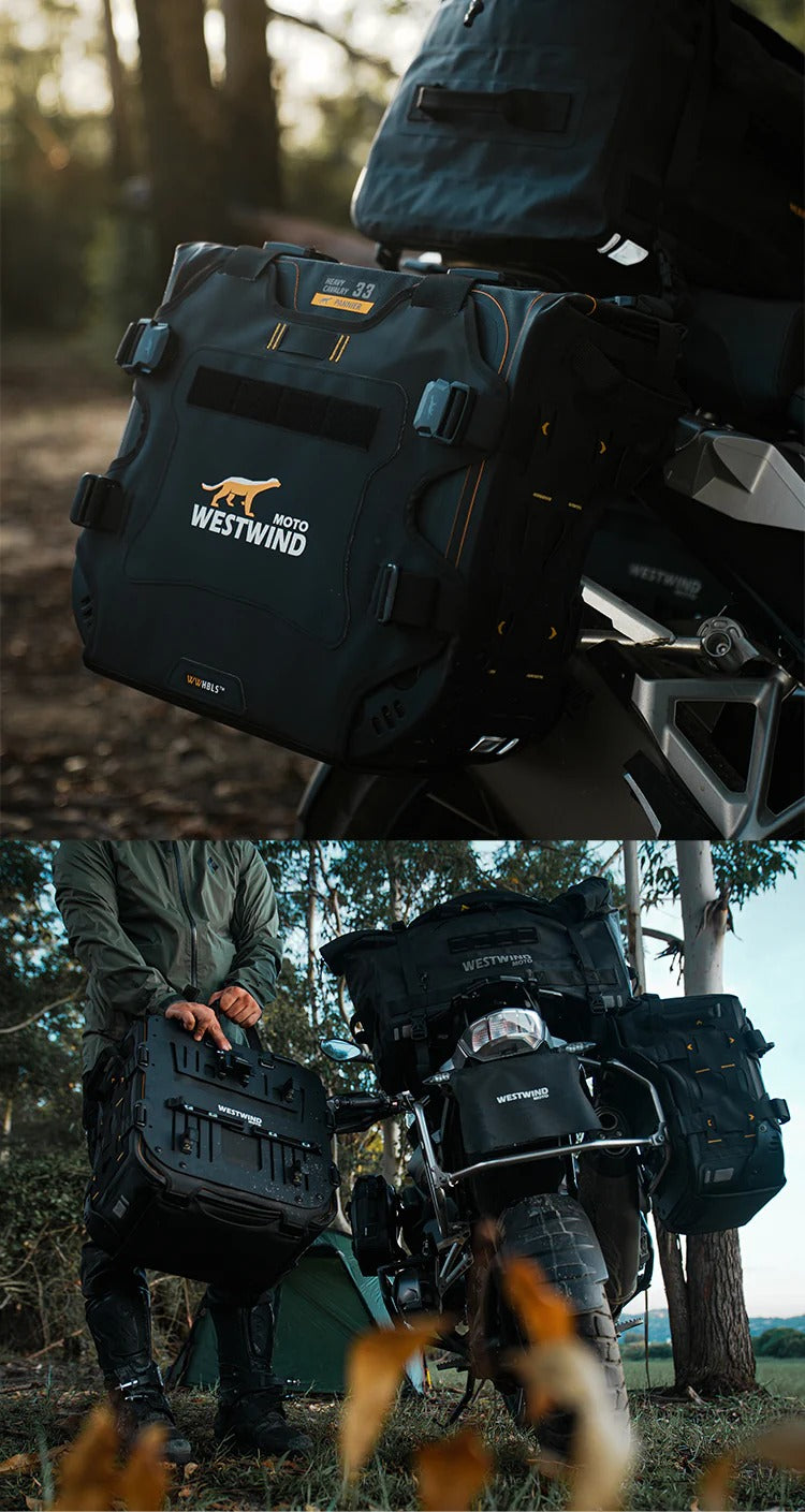 • Scopri il set di borse laterali asimmetriche Heavy Cavalry (Hussar) 33L+40L di Westwind Moto. Realizzate in tessuto ultra-resistente 1680D con design rigido anti-collasso, offrono impermeabilità totale IPX6 e un sistema di montaggio sicuro per l'adventure touring. Compatibili con i principali telai portavaligie. Acquista ora per la tua prossima avventura!