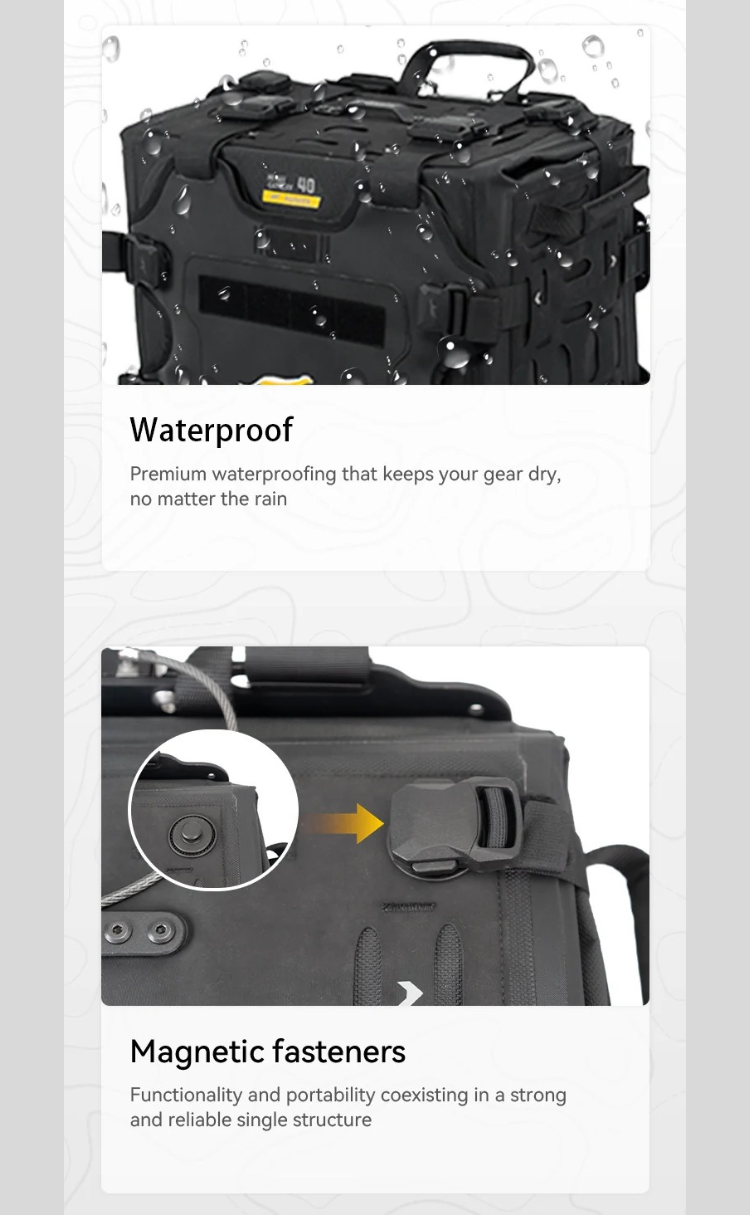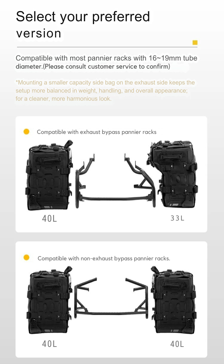 • Capacidad generosa:Configuración típica 33L + 40L o 40L + 40L por lado, perfecta para viajes de varios días.